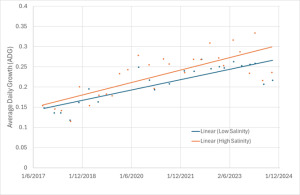 Figure 1: Average daily growth of SyAqua genetics tested in high and low salinity tested from multiple batched across 9 generations during 2017 – 2024.